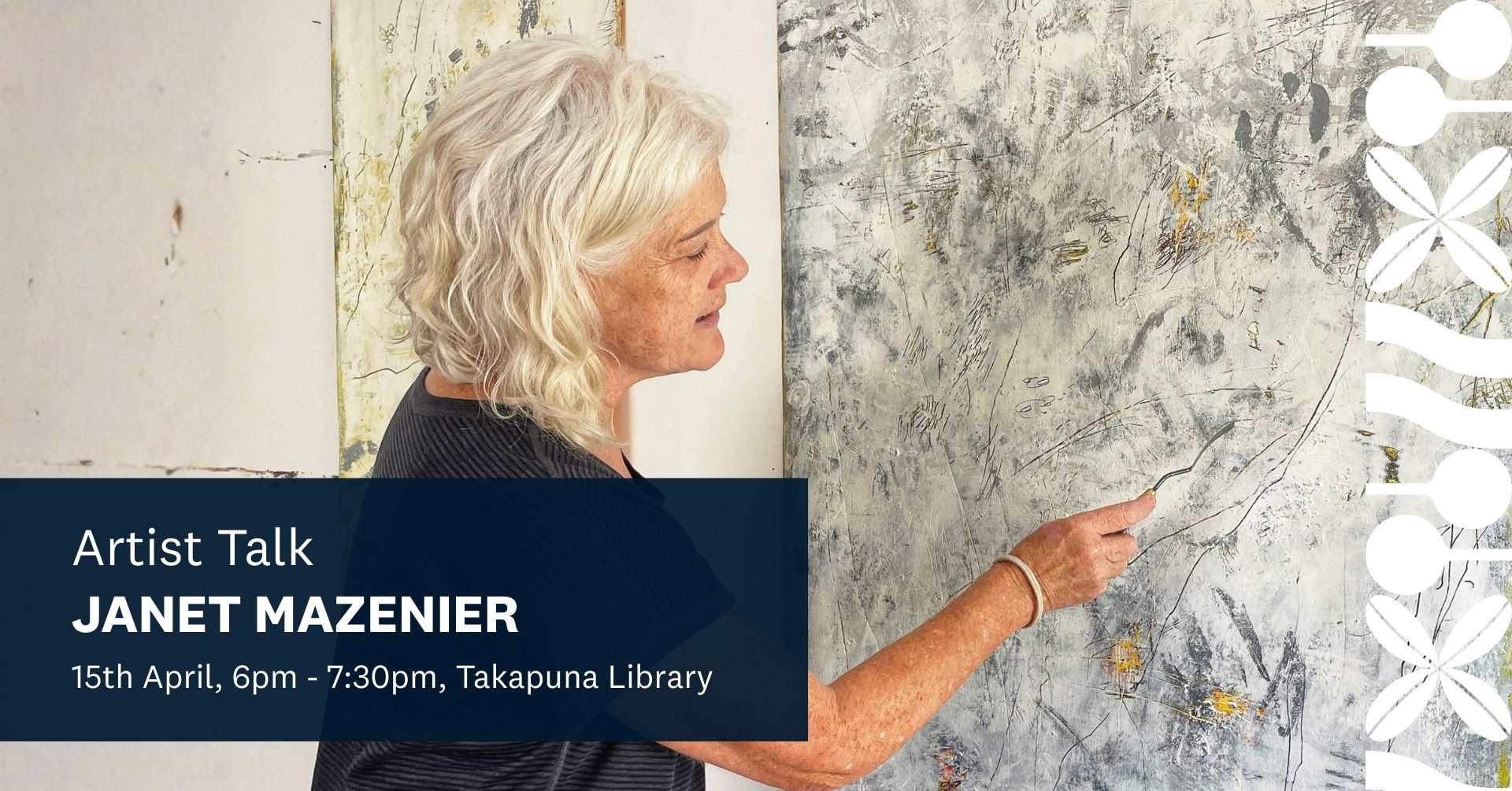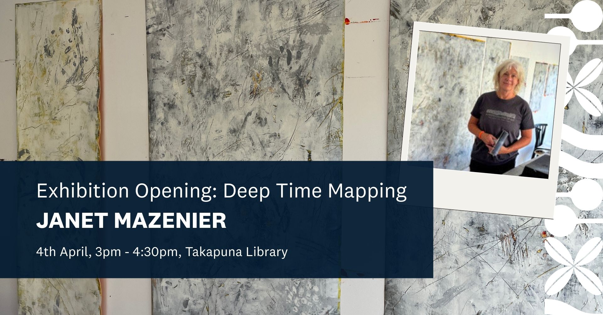 Come along for an evening with Janet Mazenier, hosted by the Friends of Takapuna Library. Janet will discuss the ideas, processes, and discoveries behind Deep Time Mapping, currently on display in the Angela Morton Room throughout April and May. A great chance to hear directly from the artist and delve deeper into the exhibition. Please RSVP: pippa.mothersole1@aucklandcouncil.govt.nz Light refreshments served on arrival. Gold coin donation appreciated.