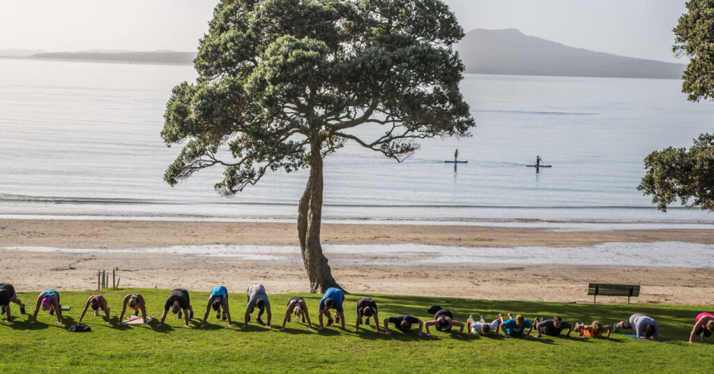 Start your day with a simple stretch session on Takapuna Beach, soaking in the morning sun and fresh air.